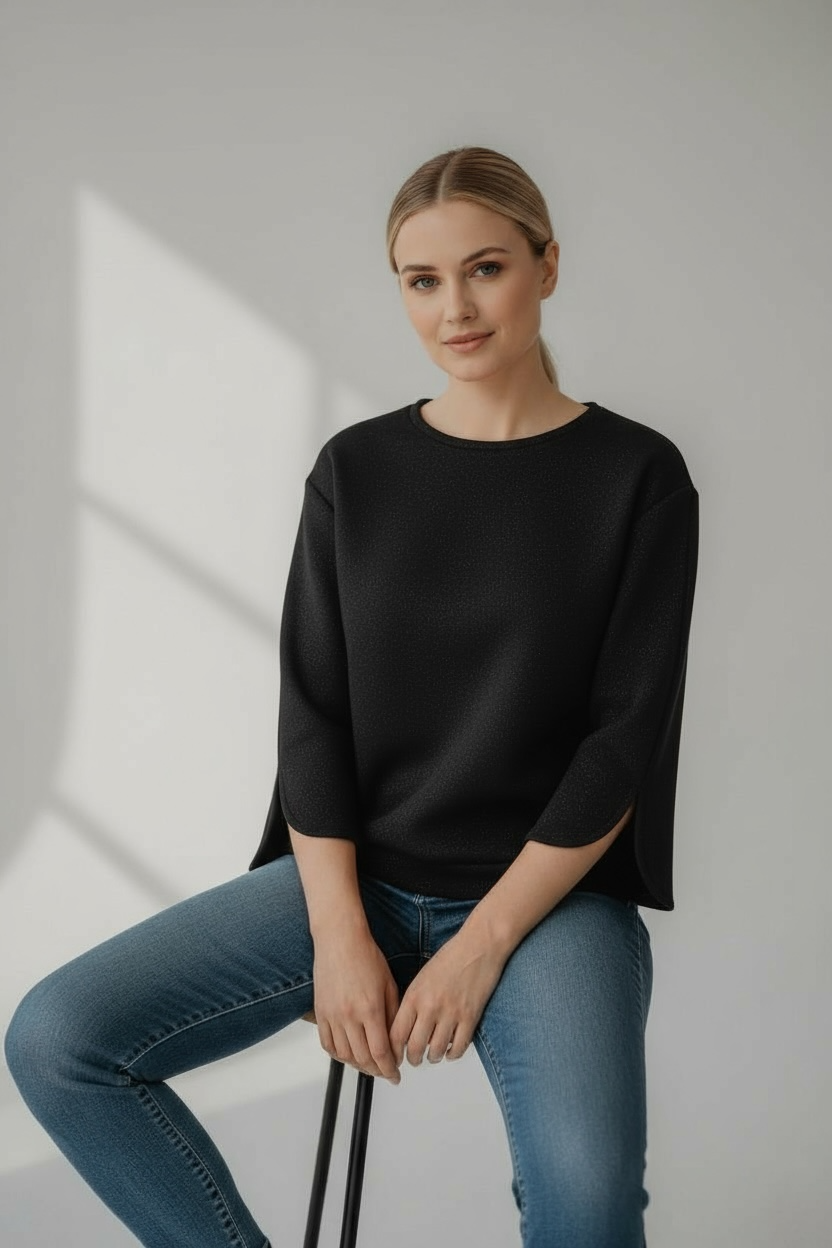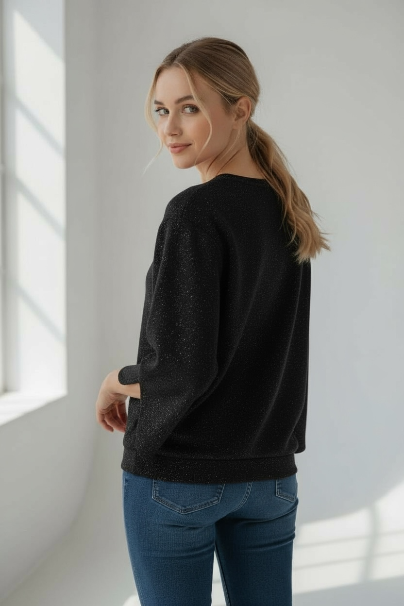 Brillant de mille éclats, ce sweat pailleté s’affirme avec ses manches qui s’ouvrent délicatement pour dévoiler un détail subtil et sophistiqué, pour une féminité assumée.