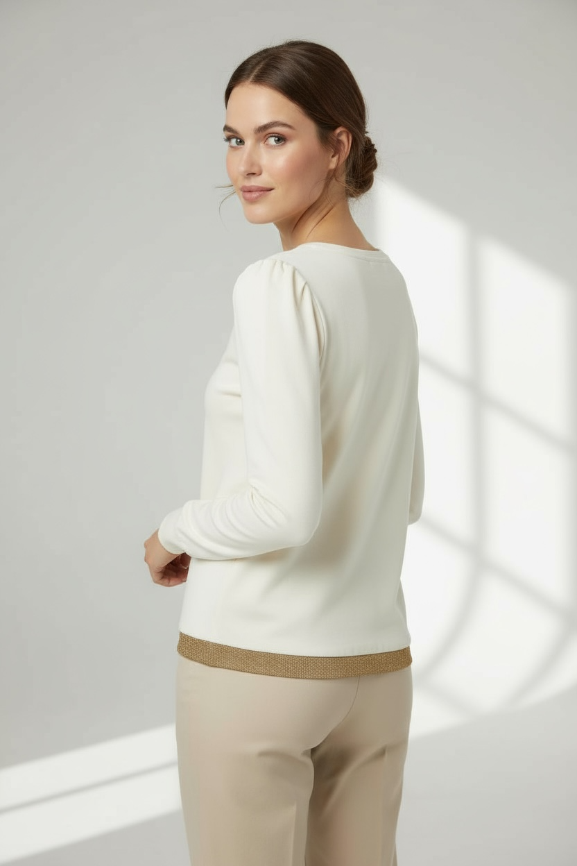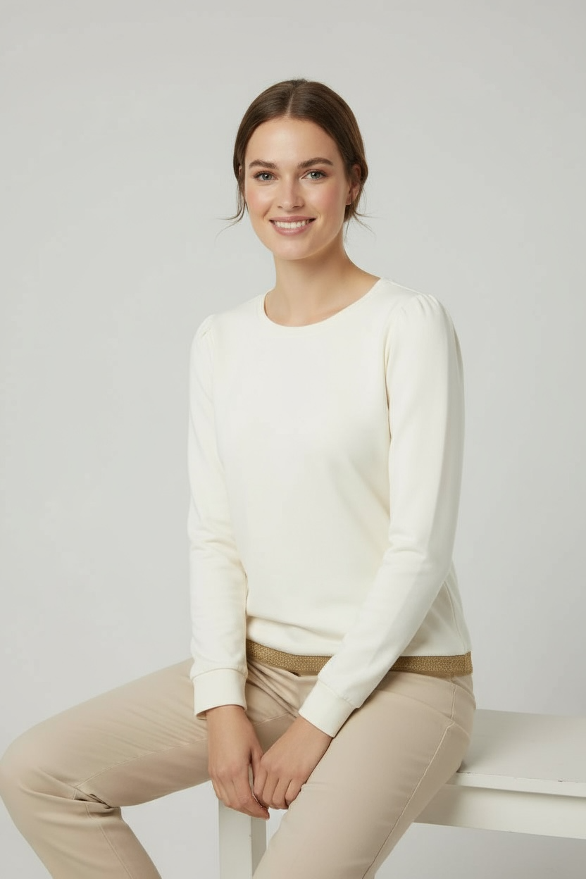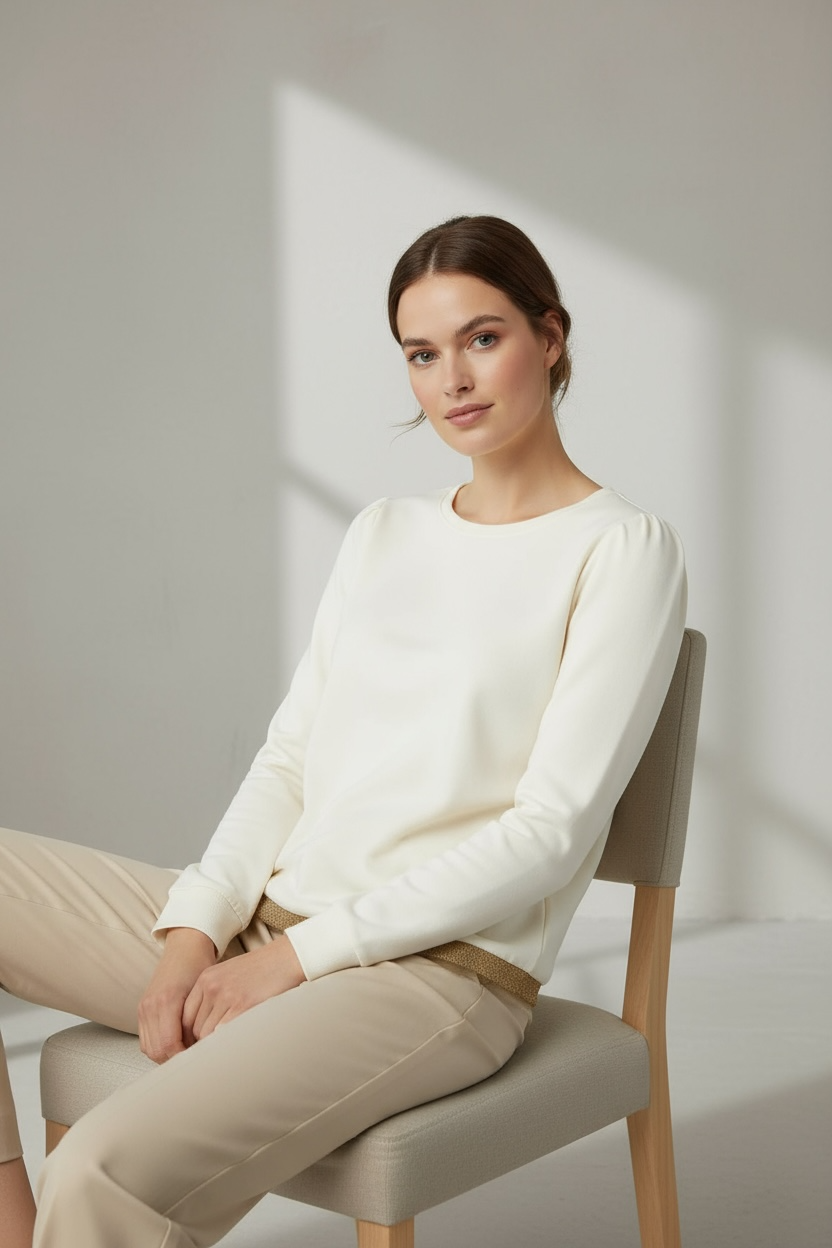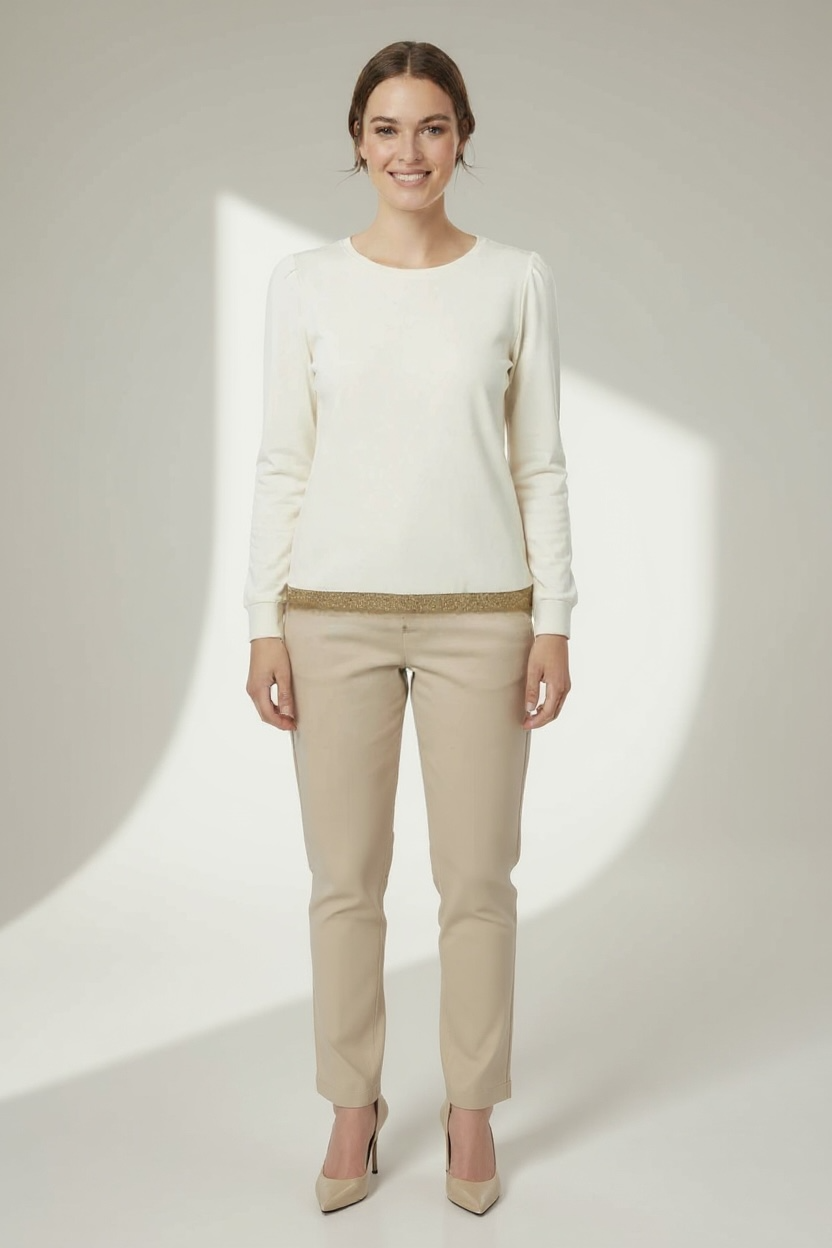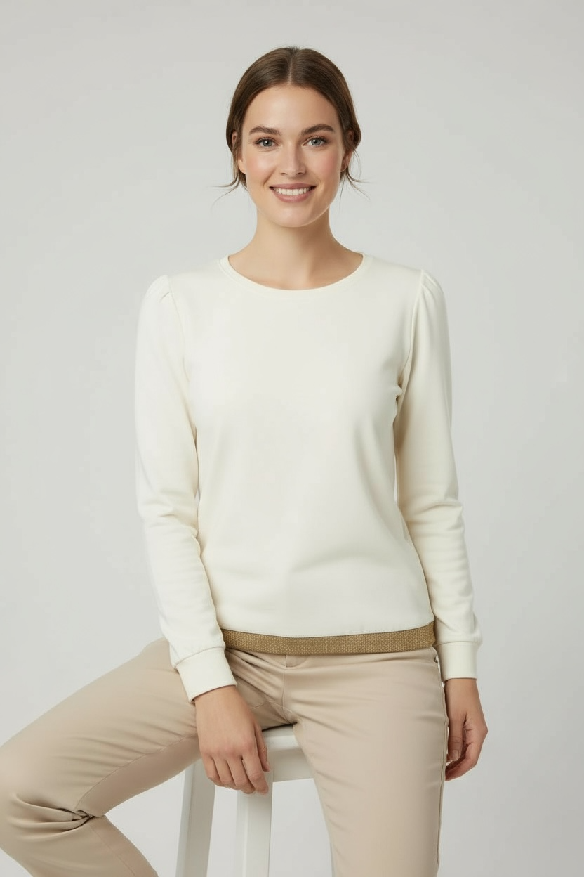 ou en sweat beige avec manche en jean ton sur ton et ceinture pailletée dorée.