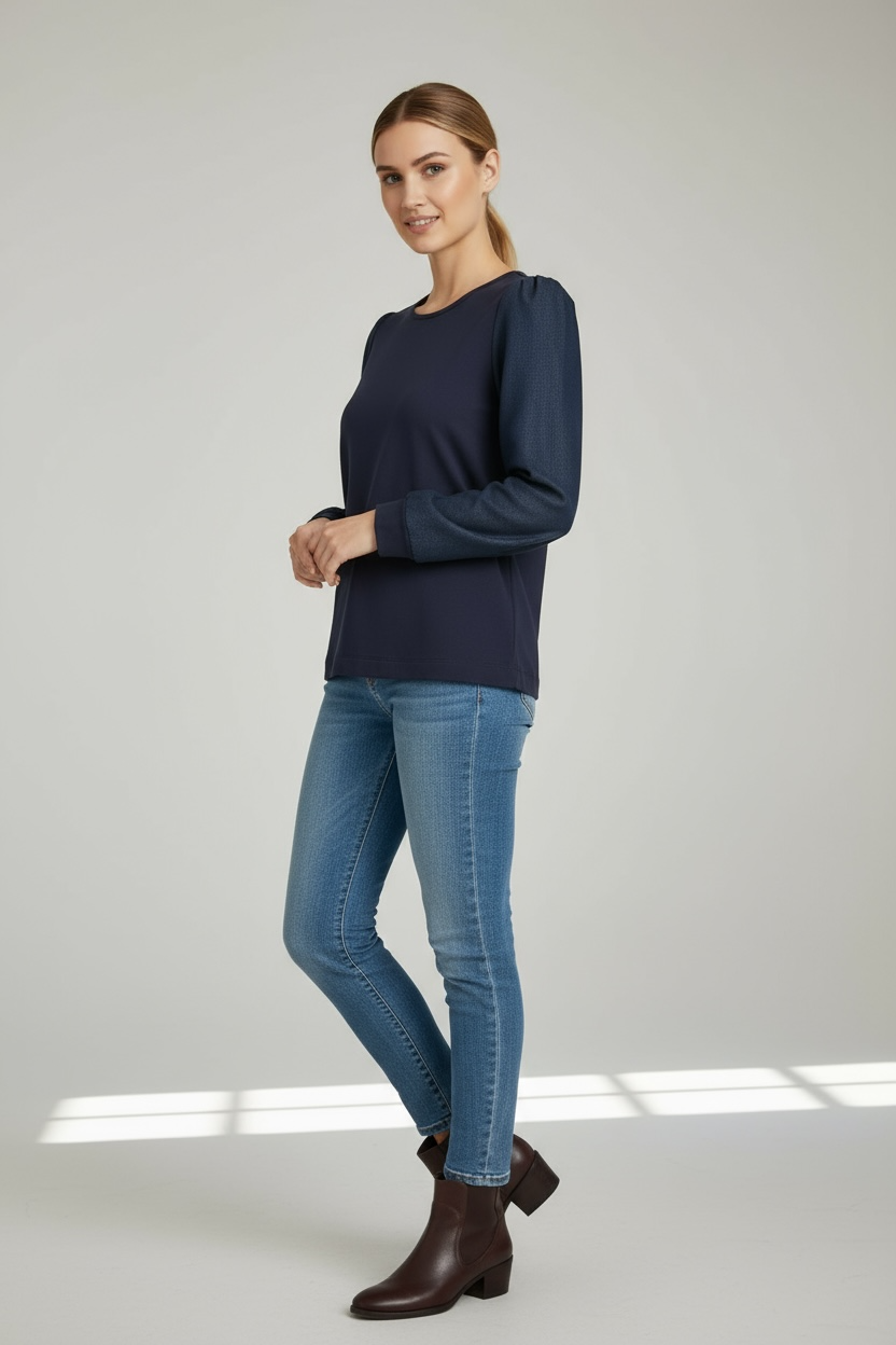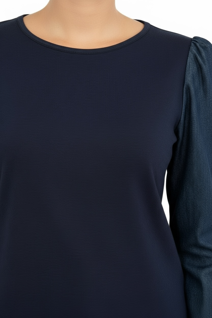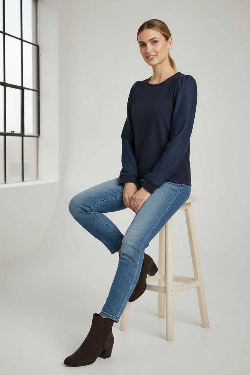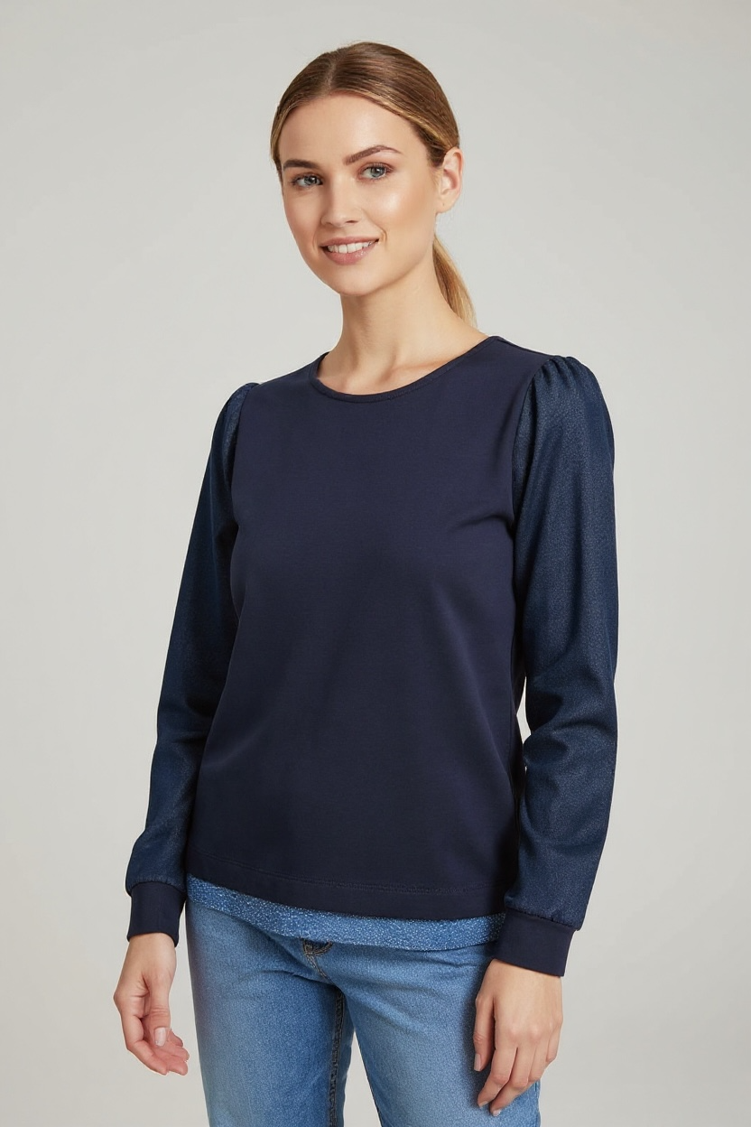 Disponible en sweat bleu avec manche en jean assorti et sa ceinture pailletée bleue,