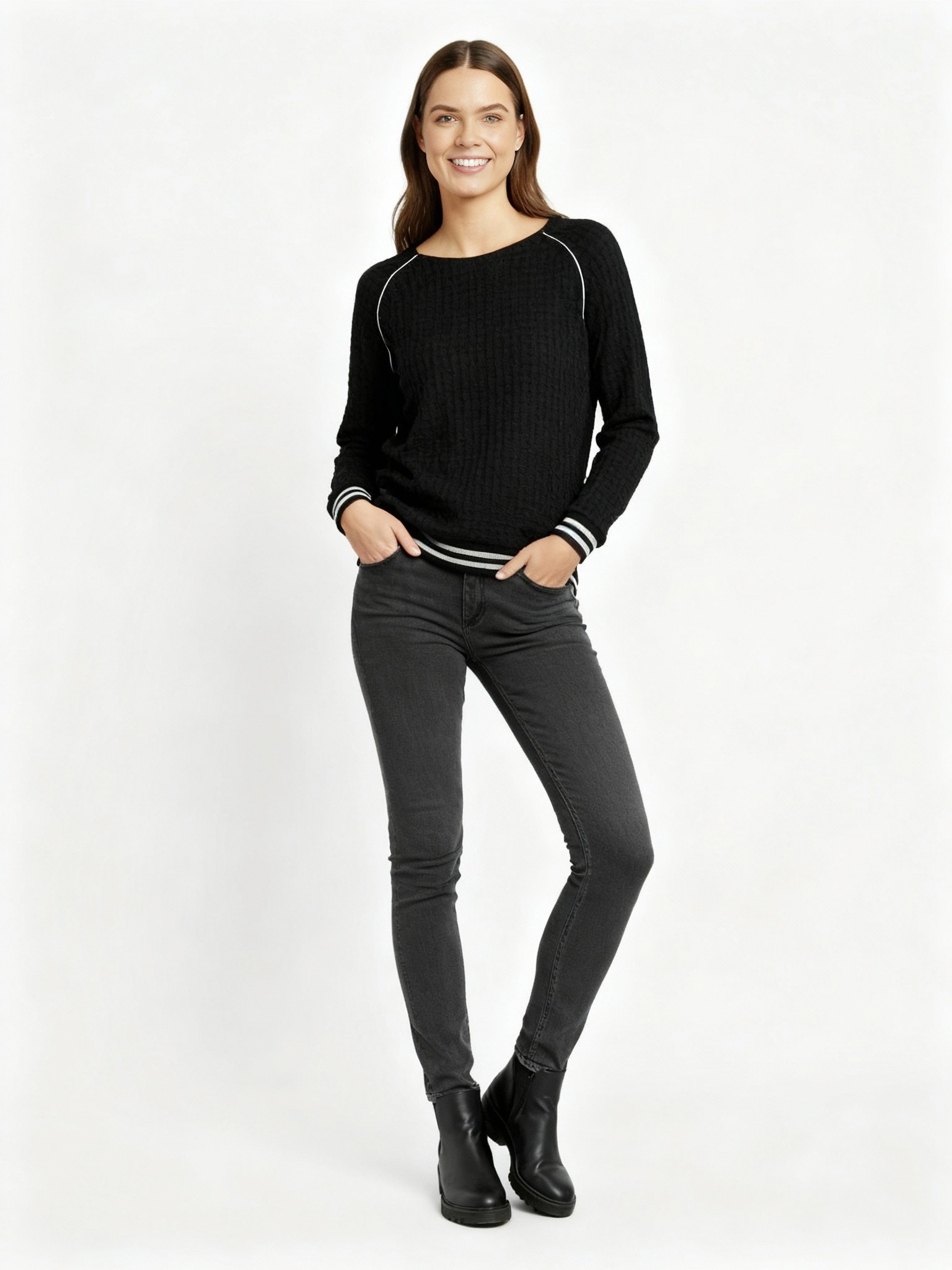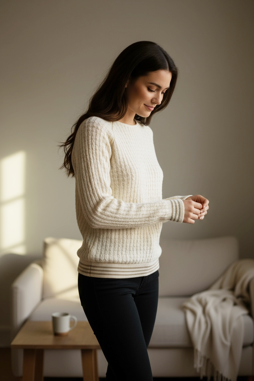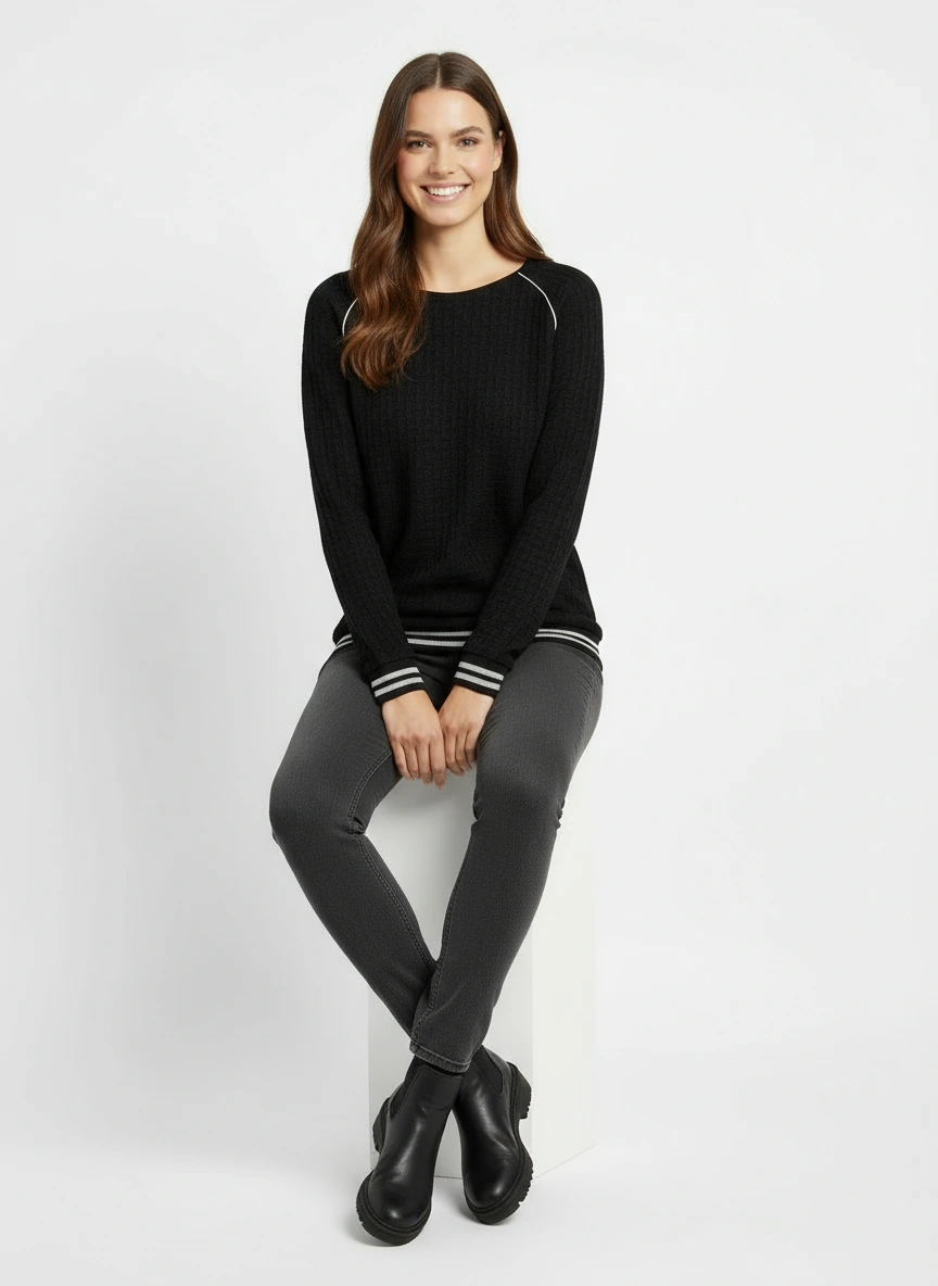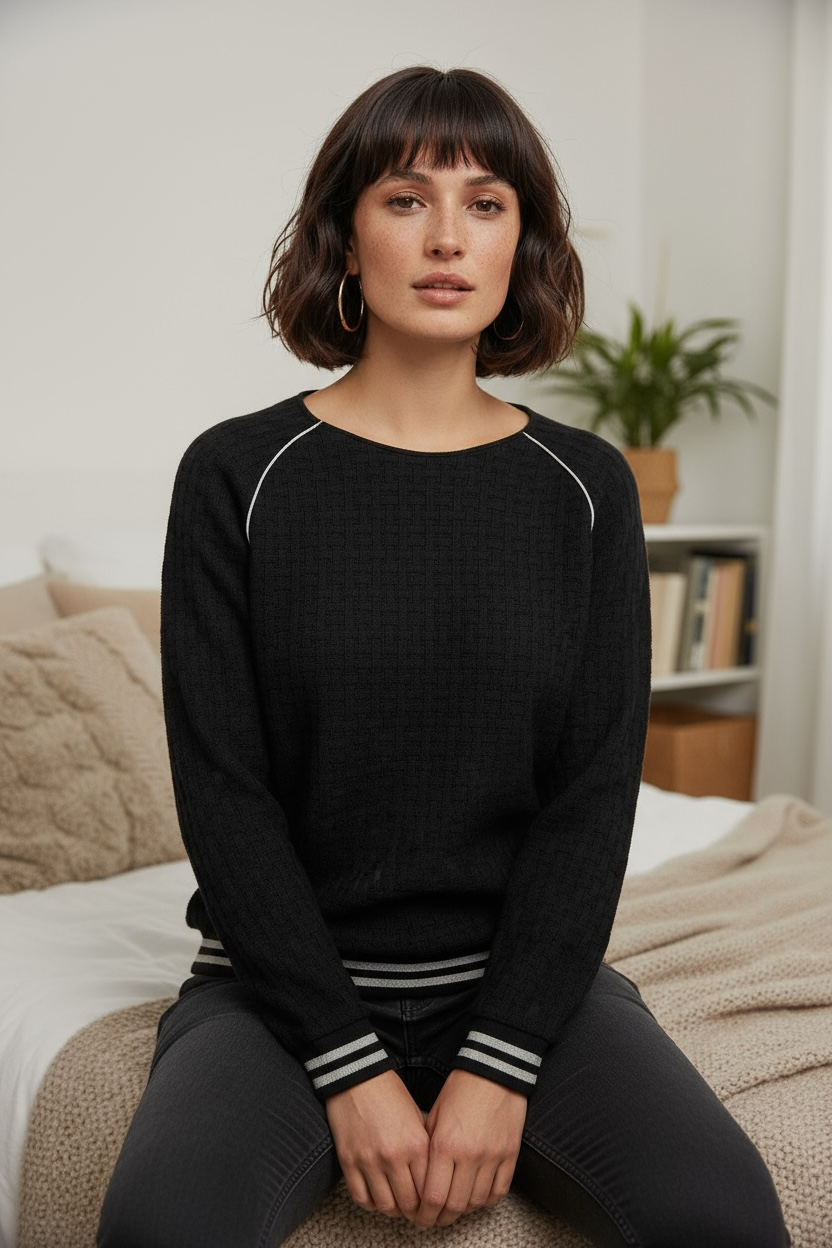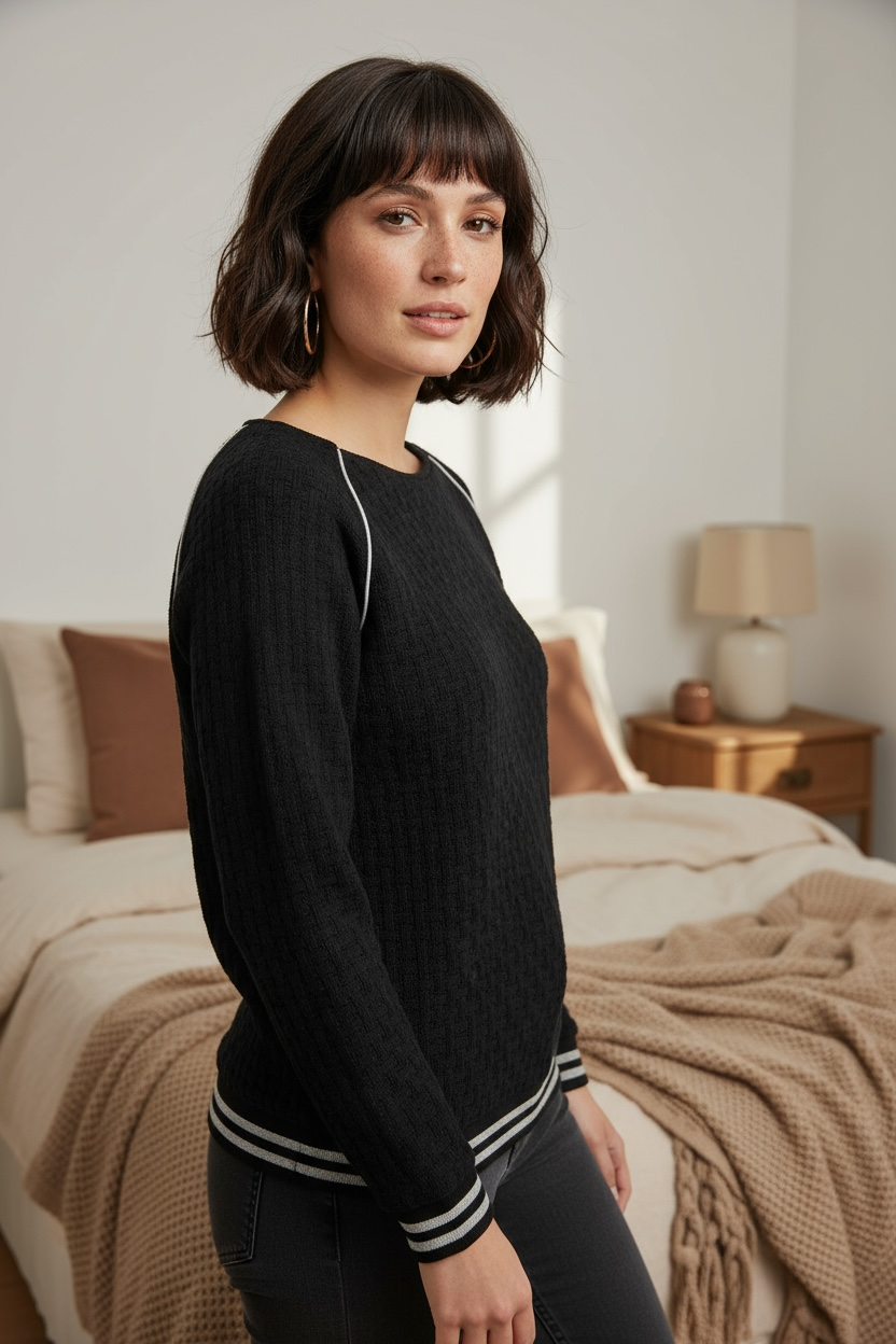 Réhaussé d’une ceinture en bord-côtes pailleté.